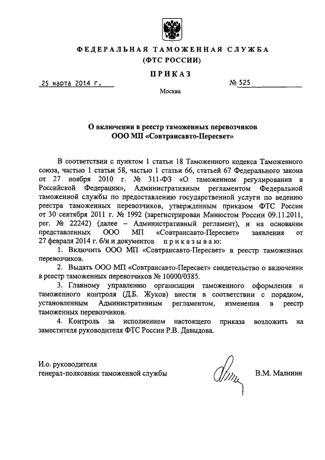 "О ВКЛЮЧЕНИИ В РЕЕСТР ТАМОЖЕННЫХ ПЕРЕВОЗЧИКОВ ООО МП "СОВТРАНСАВТО-ПЕРЕСВЕТ"
