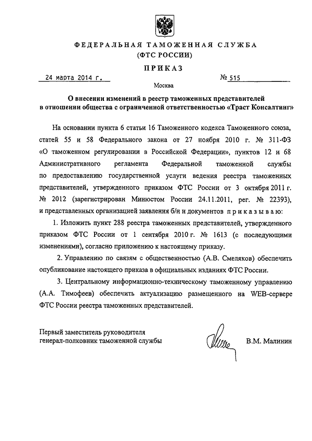 ПРИКАЗ ФТС РФ от 24.03.2014 N 515