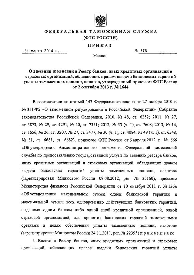 ПРИКАЗ ФТС РФ от 31.03.2014 N 578 "О ВНЕСЕНИИ ИЗМЕНЕНИЙ В РЕЕСТР БАНКОВ, ИНЫХ КРЕДИТНЫХ ОРГАНИЗАЦИЙ
