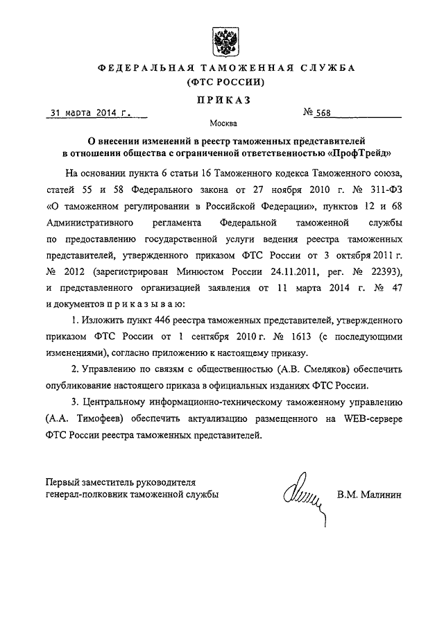 ПРИКАЗ ФТС РФ от 31.03.2014 N 568