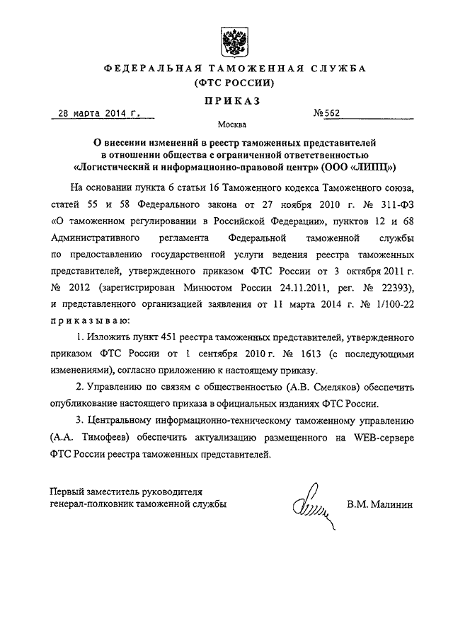 ПРИКАЗ ФТС РФ от 28.03.2014 N 562
