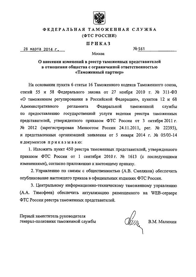 ПРИКАЗ ФТС РФ от 28.03.2014 N 561