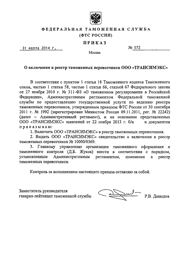 ПРИКАЗ ФТС РФ от 31.03.2014 N 572