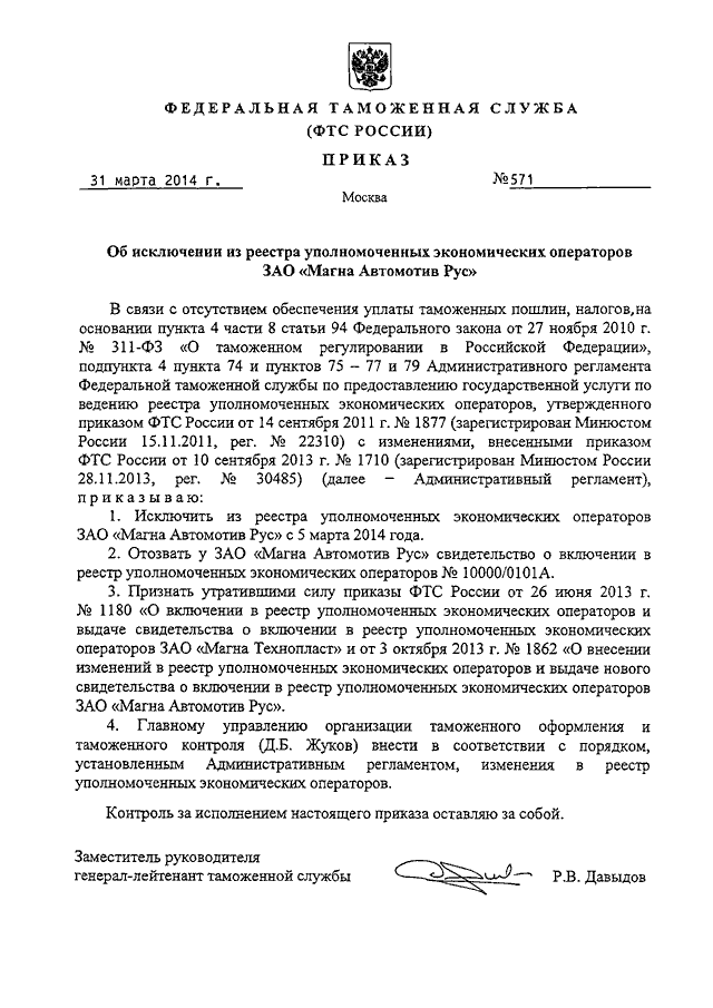 "ОБ ИСКЛЮЧЕНИИ ИЗ РЕЕСТРА УПОЛНОМОЧЕННЫХ ЭКОНОМИЧЕСКИХ ОПЕРАТОРОВ ЗАО "МАГНА АВТОМОТИВ РУС"