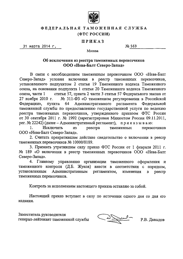 ПРИКАЗ ФТС РФ от 31.03.2014 N 569
