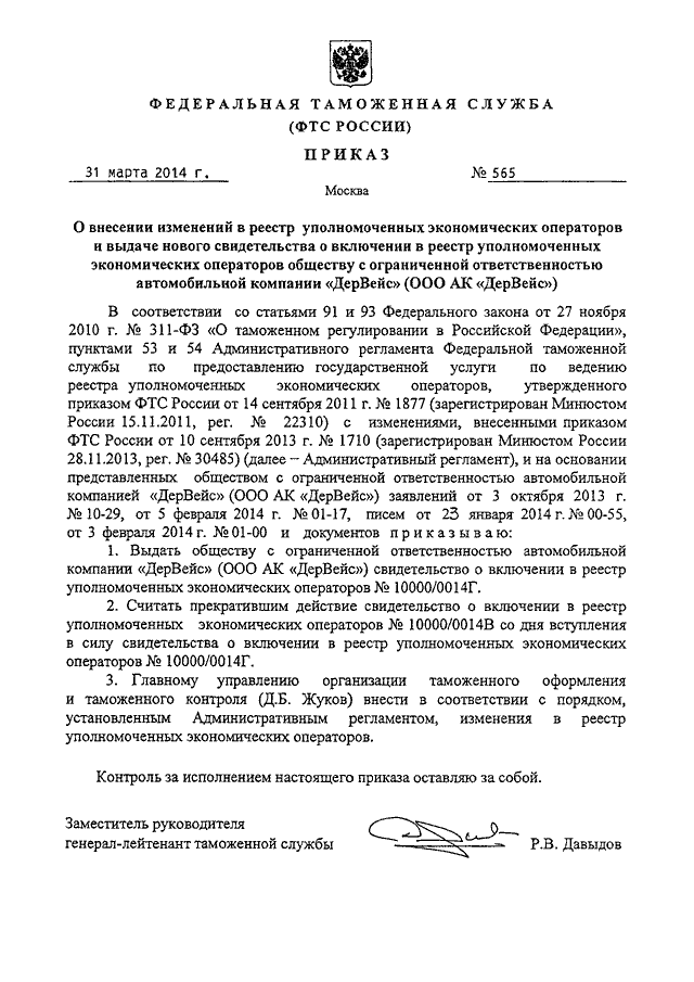 ПРИКАЗ ФТС РФ от 31.03.2014 N 565 "О ВНЕСЕНИИ ИЗМЕНЕНИЙ В РЕЕСТР УПОЛНОМОЧЕННЫХ ЭКОНОМИЧЕСКИХ