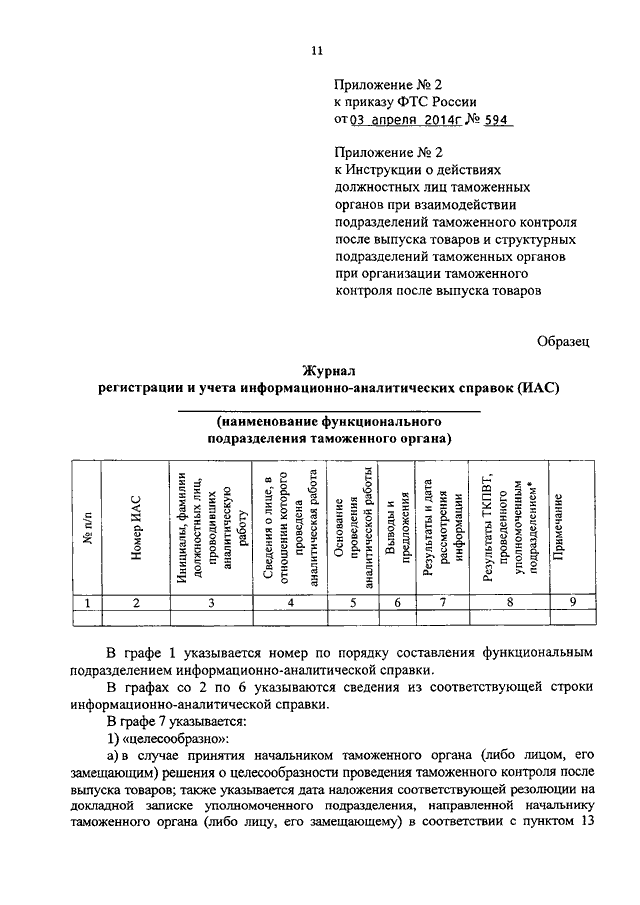 ПРИКАЗ ФТС РФ от 03.04.2014 N 594