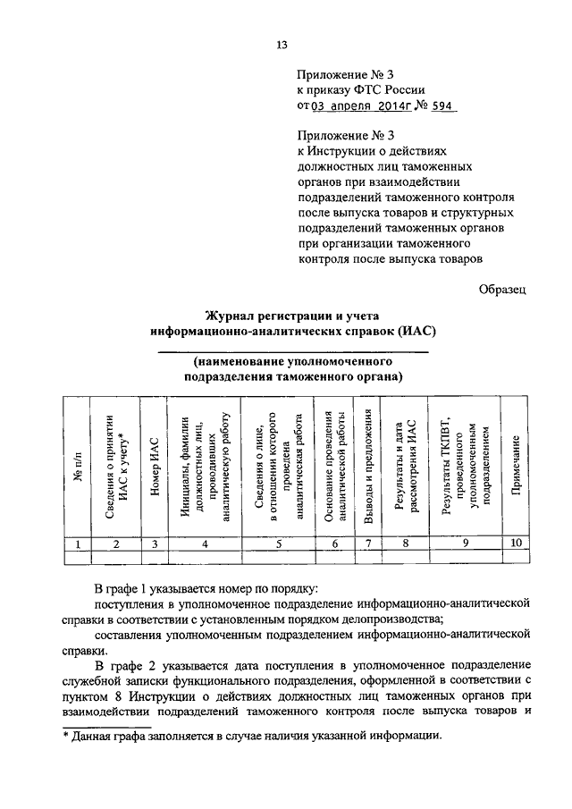 ПРИКАЗ ФТС РФ от 03.04.2014 N 594