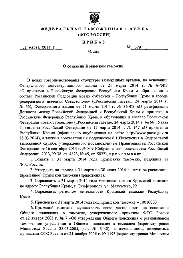 ПРИКАЗ ФТС РФ от 31.03.2014 N 579