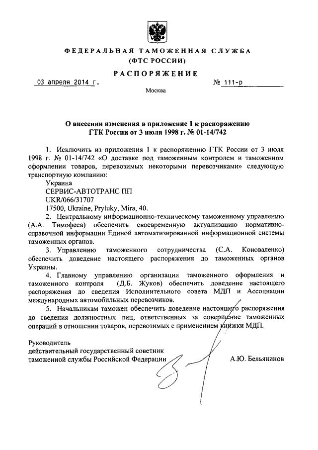 РАСПОРЯЖЕНИЕ ФТС РФ от 03.04.2014 N 111-р