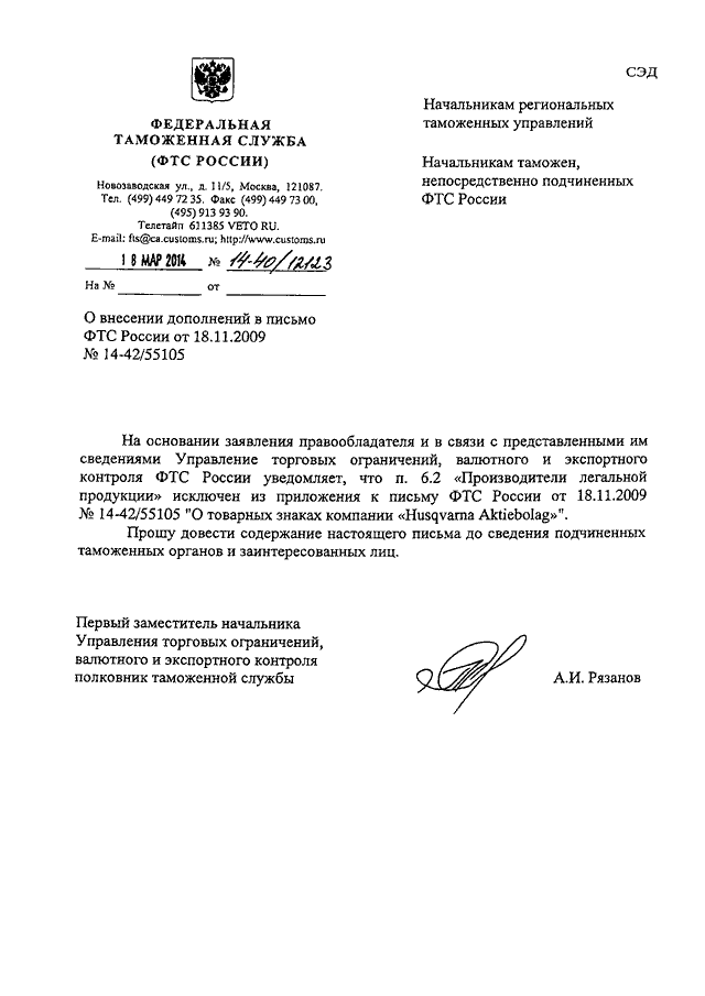 ПИСЬМО ФТС РФ от 18.03.2014 N 14-40/12123