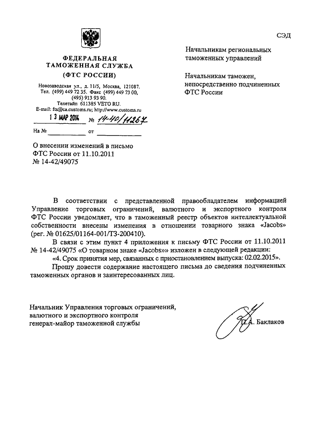 ПИСЬМО ФТС РФ от 13.03.2014 N 14-40/11267