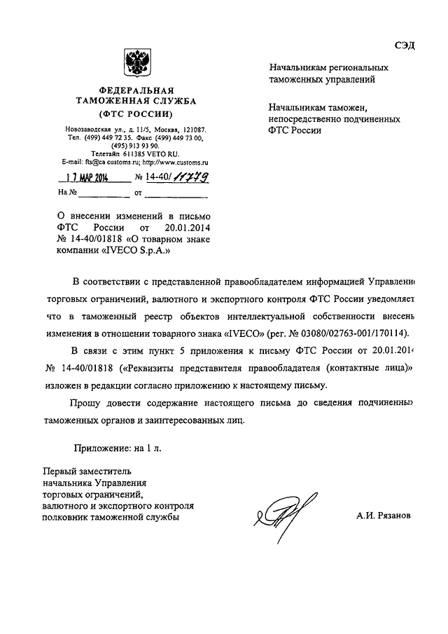 "О ВНЕСЕНИИ ИЗМЕНЕНИЙ В ПИСЬМО ФТС РОССИИ ОТ 20.01.2014 N 14-40/01818 "О ТОВАРНОМ ЗНАКЕ КОМПАНИИ "IVECO S.P.A."