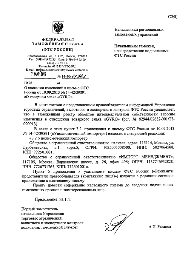 "О ВНЕСЕНИИ ИЗМЕНЕНИЙ В ПИСЬМО ФТС РОССИИ ОТ 10.09.2013 N 14-42/39891 "О ТОВАРНОМ ЗНАКЕ "GYRO"