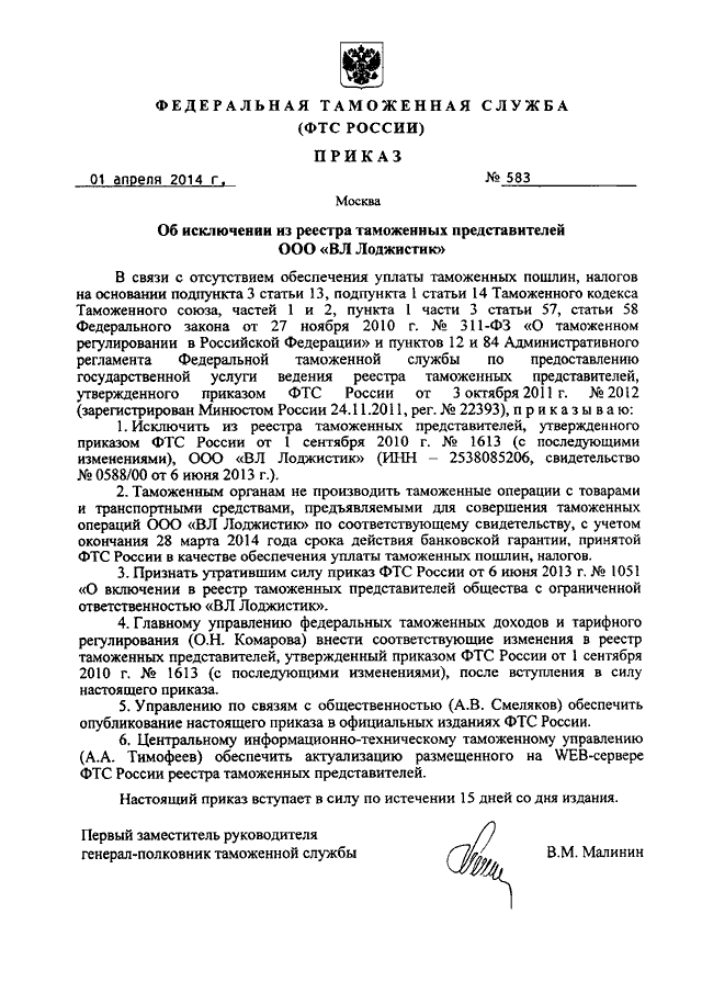 ПРИКАЗ ФТС РФ от 01.04.2014 N 583