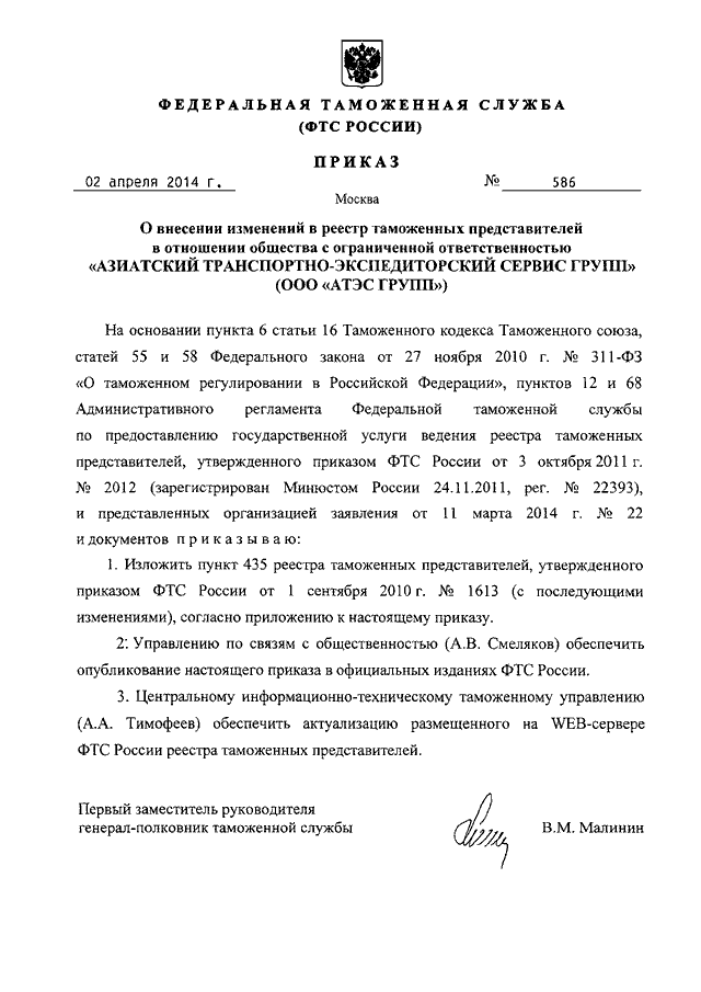ПРИКАЗ ФТС РФ от 02.04.2014 N 586