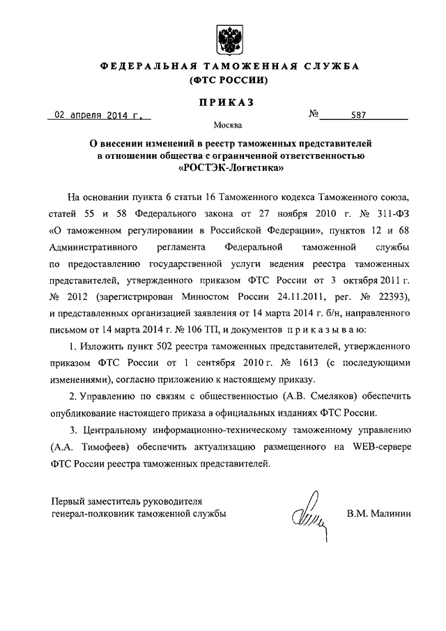ПРИКАЗ ФТС РФ от 02.04.2014 N 587