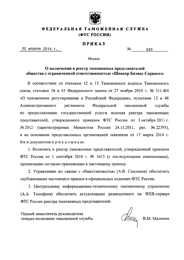 ПРИКАЗ ФТС РФ от 02.04.2014 N 590