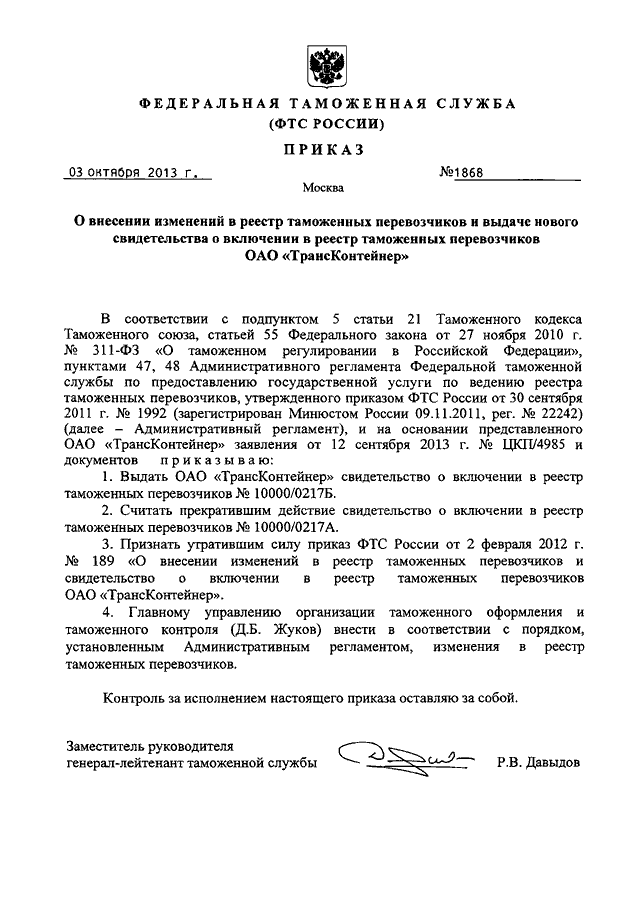 ПРИКАЗ ФТС РФ от 03.10.2013 N 1868