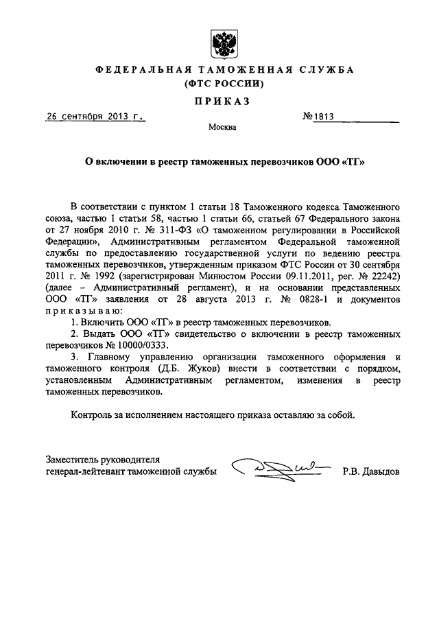 ПРИКАЗ ФТС РФ от 26.09.2013 N 1813