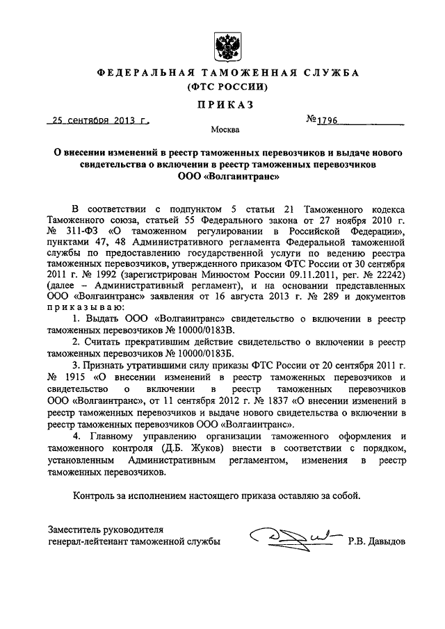 ПРИКАЗ ФТС РФ от 25.09.2013 N 1796