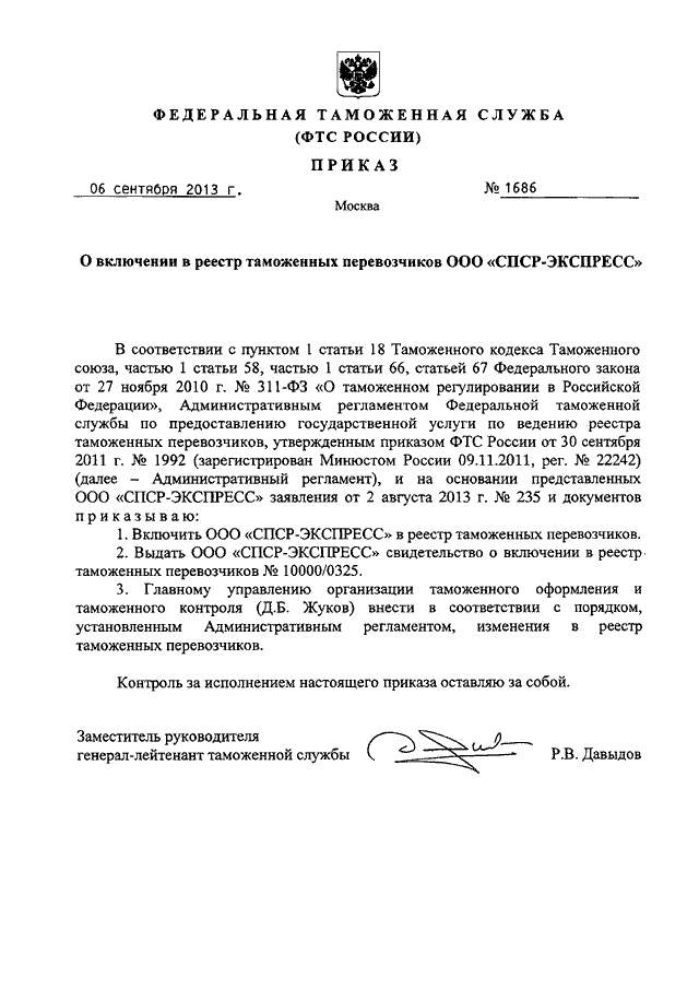 "О ВКЛЮЧЕНИИ В РЕЕСТР ТАМОЖЕННЫХ ПЕРЕВОЗЧИКОВ ООО "СПСР-ЭКСПРЕСС"