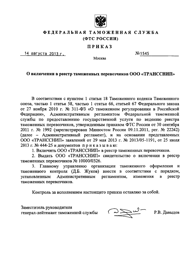 ПРИКАЗ ФТС РФ от 14.08.2013 N 1545
