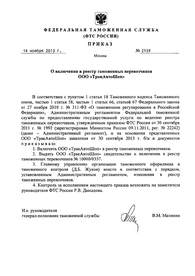 ПРИКАЗ ФТС РФ от 14.11.2013 N 2159