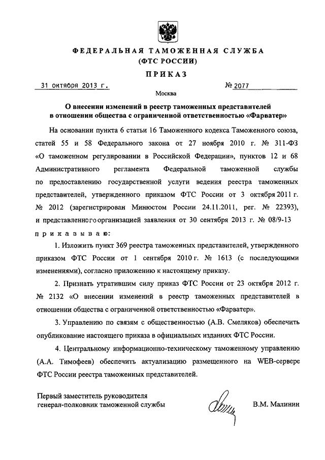 ПРИКАЗ ФТС РФ от 31.10.2013 N 2077