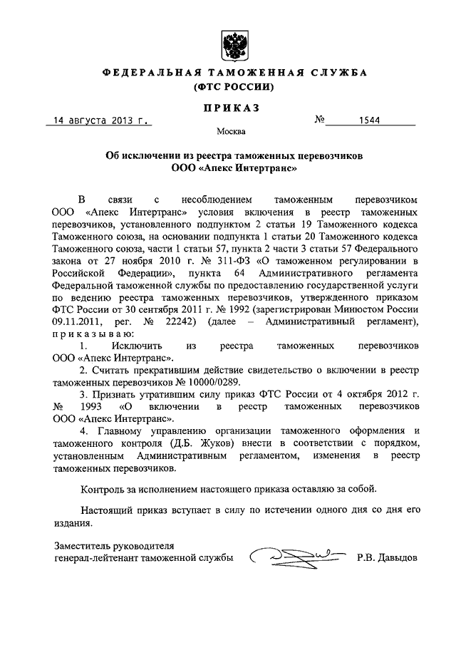 ПРИКАЗ ФТС РФ от 14.08.2013 N 1544