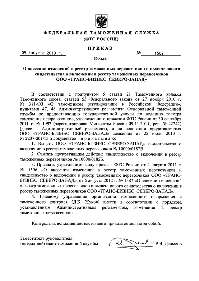 "О ВНЕСЕНИИ ИЗМЕНЕНИЙ В РЕЕСТР ТАМОЖЕННЫХ ПЕРЕВОЗЧИКОВ И ВЫДАЧЕ НОВОГО СВИДЕТЕЛЬСТВА О ВКЛЮЧЕНИИ В РЕЕСТР ТАМОЖЕННЫХ ПЕРЕВОЗЧИКОВ ООО "ТРАНС-БИЗНЕС СЕВЕРО - ЗАПАД"