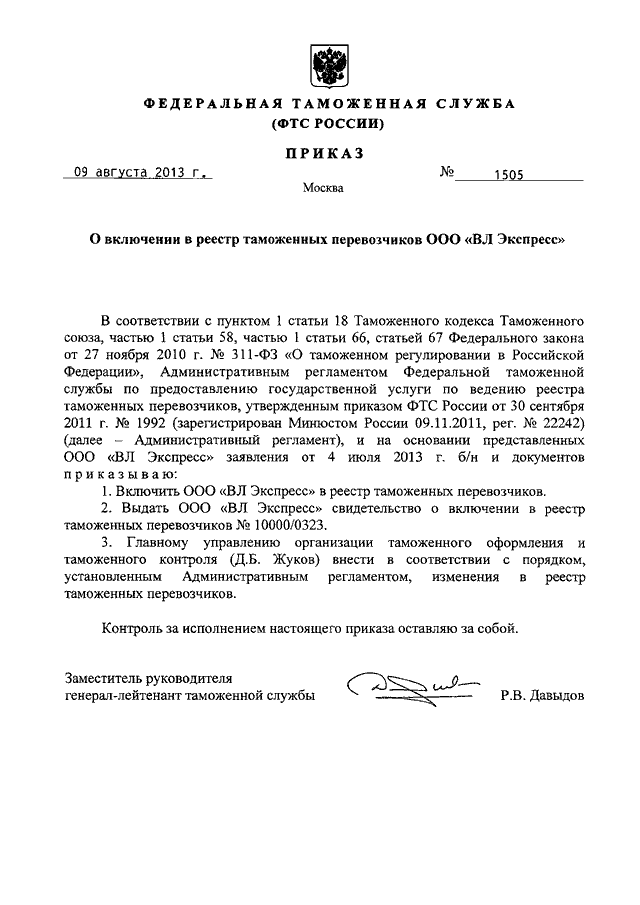 "О ВКЛЮЧЕНИИ В РЕЕСТР ТАМОЖЕННЫХ ПЕРЕВОЗЧИКОВ ООО "ВЛ ЭКСПРЕСС"