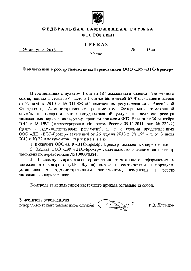 "О ВКЛЮЧЕНИИ В РЕЕСТР ТАМОЖЕННЫХ ПЕРЕВОЗЧИКОВ ООО "ДФ "ВТС-БРОКЕР"