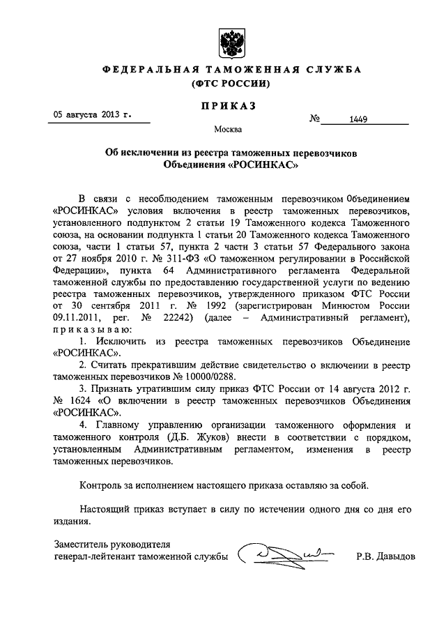 ПРИКАЗ ФТС РФ от 05.08.2013 N 1449