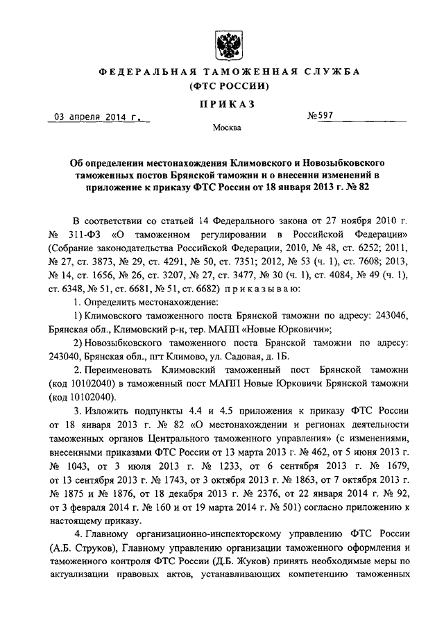 "ОБ ОПРЕДЕЛЕНИИ МЕСТОНАХОЖДЕНИЯ КЛИМОВСКОГО И НОВОЗЫБКОВСКОГО ТАМОЖЕННЫХ ПОСТОВ БРЯНСКОЙ ТАМОЖНИ И О ВНЕСЕНИИ ИЗМЕНЕНИЙ В ПРИЛОЖЕНИЕ К ПРИКАЗУ ФТС РОССИИ ОТ 18 ЯНВАРЯ 2013 Г. N 82"