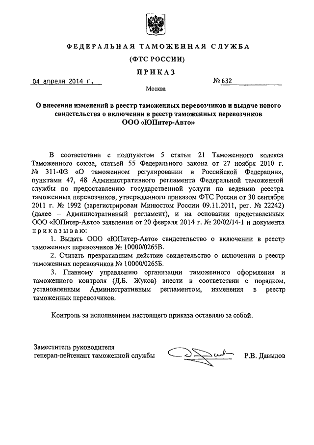 ПРИКАЗ ФТС РФ от 04.04.2014 N 632