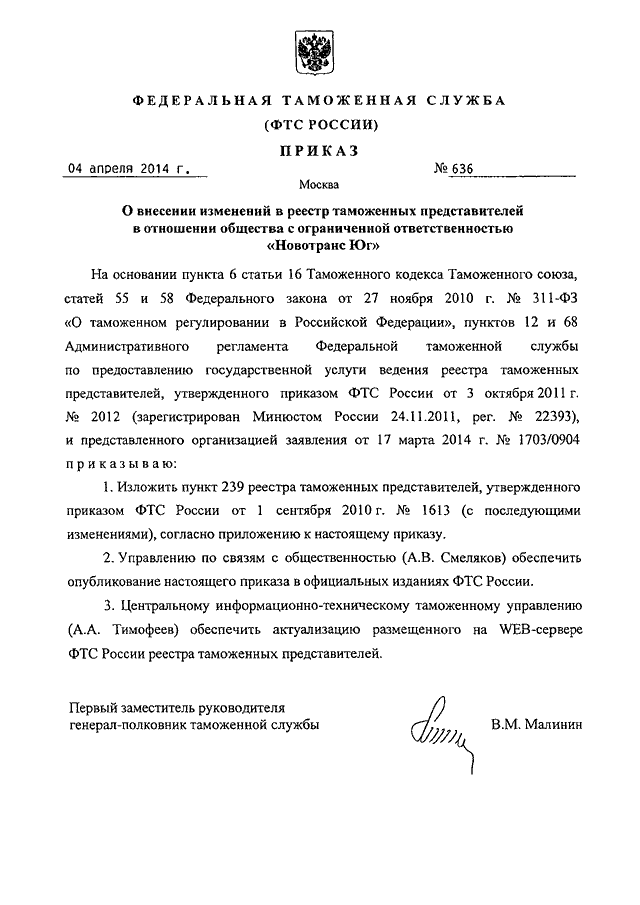 ПРИКАЗ ФТС РФ от 04.04.2014 N 636