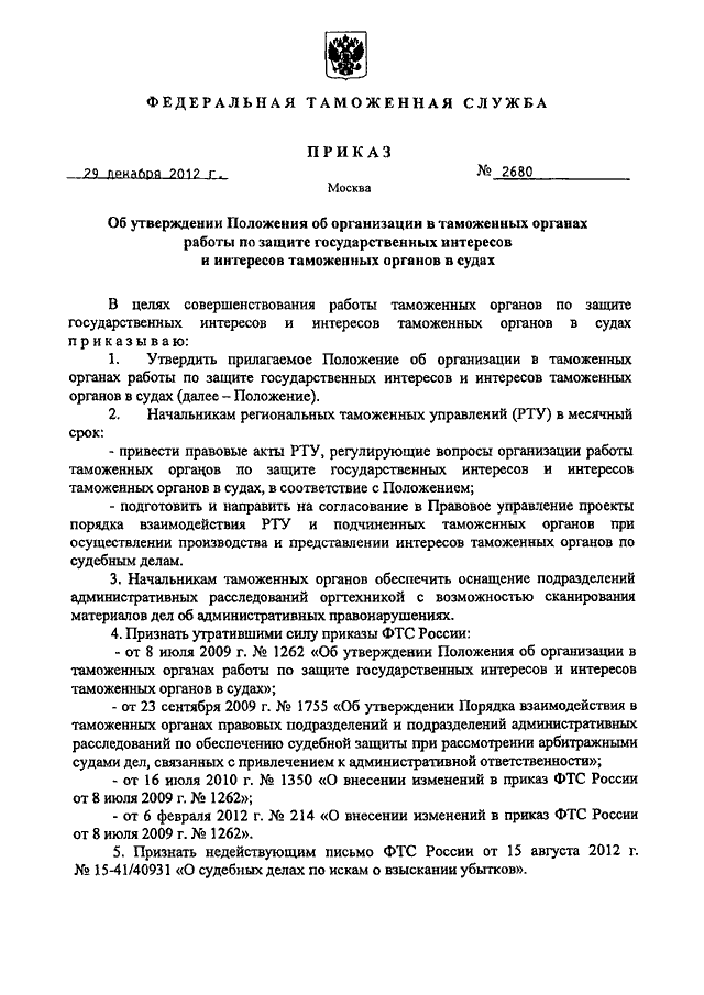 ПРИКАЗ ФТС РФ от 29.12.2012 N 2680