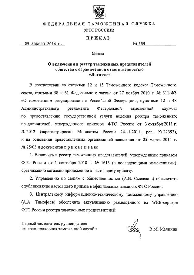 ПРИКАЗ ФТС РФ от 09.04.2014 N 659