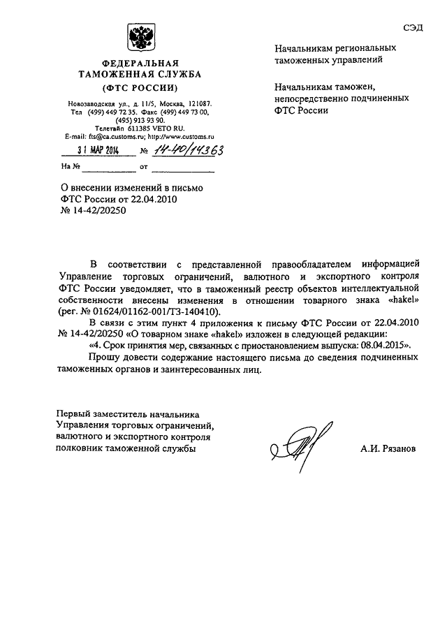 ПИСЬМО ФТС РФ от 31.03.2014 N 14-40/14363