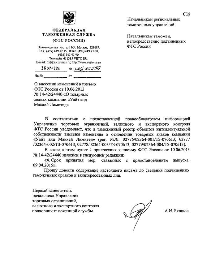 "О ВНЕСЕНИИ ИЗМЕНЕНИЙ В ПИСЬМО ФТС РОССИИ ОТ 10.06.2013 N 14-42/24440 "О ТОВАРНЫХ ЗНАКАХ КОМПАНИИ "УАЙТ ЭНД МАККЕЙ ЛИМИТЕД"