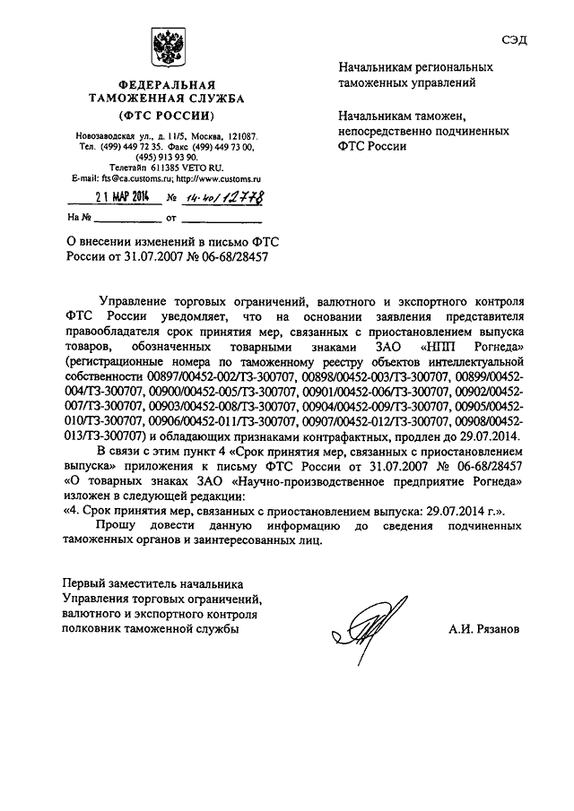 ПИСЬМО ФТС РФ от 21.03.2014 N 14-40/12778