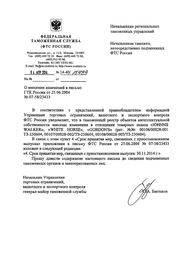 ПИСЬМО ФТС РФ от 04.04.2014 N 14-40/15499