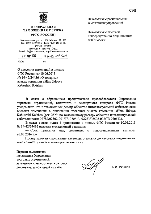 "О ВНЕСЕНИИ ИЗМЕНЕНИЙ В ПИСЬМО ФТС РОССИИ ОТ 10.06.2013 N 14-42/24436 "О ТОВАРНЫХ ЗНАКАХ КОМПАНИИ "HINO JIDOSYA KABUSHIKI KAISHA"