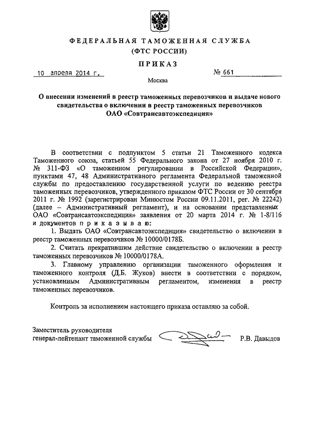 ПРИКАЗ ФТС РФ от 10.04.2014 N 661