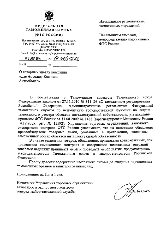 ПИСЬМО ФТС РФ от 04.04.2014 N 14-40/15278