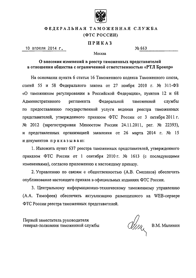 ПРИКАЗ ФТС РФ от 10.04.2014 N 663