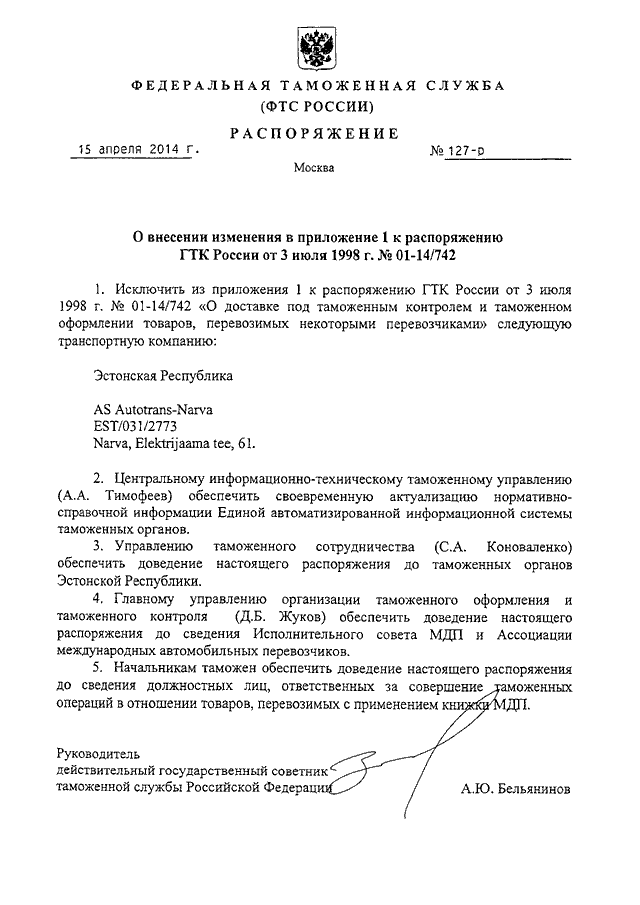РАСПОРЯЖЕНИЕ ФТС РФ от 15.04.2014 N 127-р