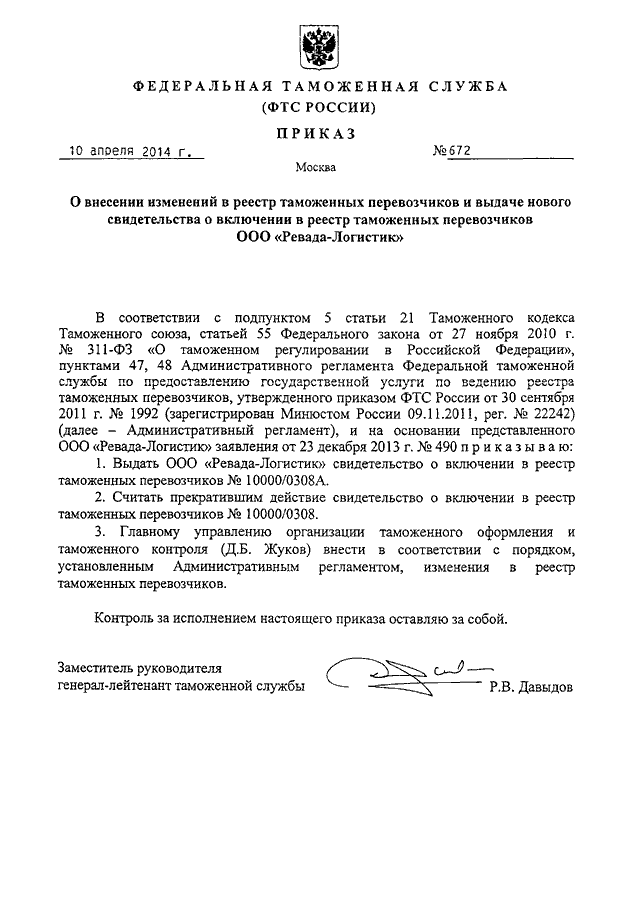 "О ВНЕСЕНИИ ИЗМЕНЕНИЙ В РЕЕСТР ТАМОЖЕННЫХ ПЕРЕВОЗЧИКОВ И ВЫДАЧЕ НОВОГО СВИДЕТЕЛЬСТВА О ВКЛЮЧЕНИИ В РЕЕСТР ТАМОЖЕННЫХ ПЕРЕВОЗЧИКОВ ООО "РЕВАДА-ЛОГИСТИК"
