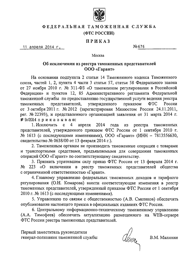 ПРИКАЗ ФТС РФ от 11.04.2014 N 676